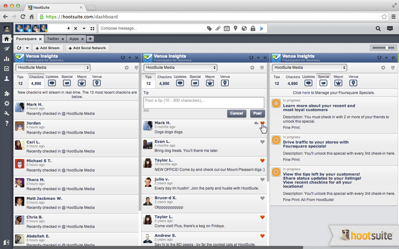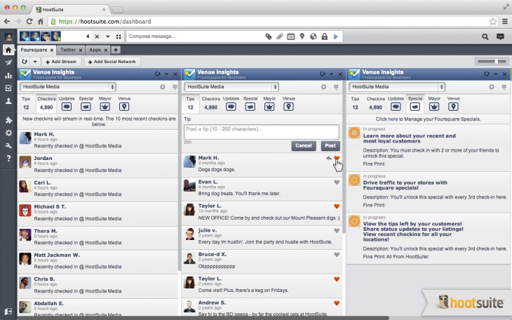 Users can set up a column in HootSuite to view the current mayor for their stores, update the details for their venue, create status updates and track the current offers that they’re holding at their venue.